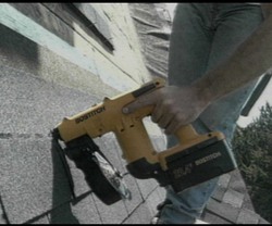 Battery operated, or cordless, tools have also become common on construction sites. But up until now, no one has made a battery operated nailer -- batteries just couldn't deliver enough power in a single blow. But then Stanley hit on the idea of adapting the concept of the multiple impact of a hammer drill to drive in a roofing nail. I took the TV cameras to visit the factory and follow the interesting history of the development of this new power tool -- the world's first cordless roofing hammer.